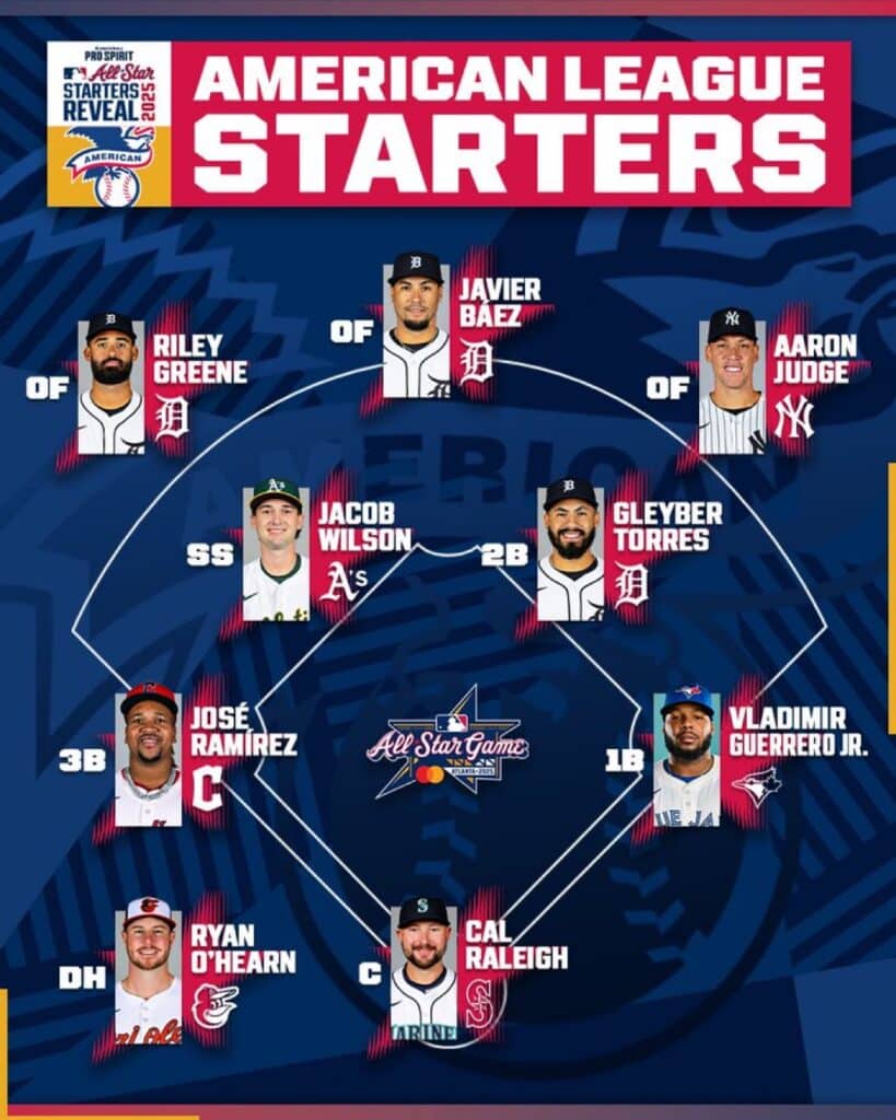 - C: Cal Raleigh (Seattle Mariners) – primer catcher con 33 jonrones antes del ASG, Raleigh tiene un OPS de 1.024 y 33 vuelacercas en 84 juegos, mientras que su WAR de 5.6 (FanGraphs) es superado sólo por Judge. Raleigh es el primer catcher de los Marineros en ser seleccionado para formar parte del lineup abridro del Juego de Estrellas.
